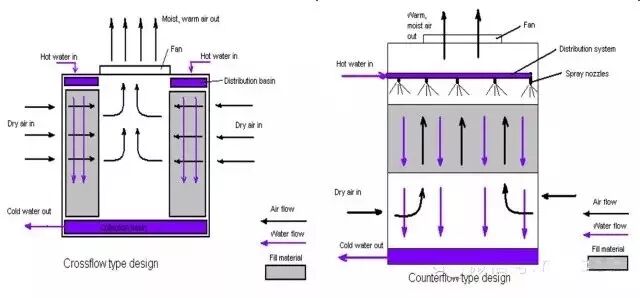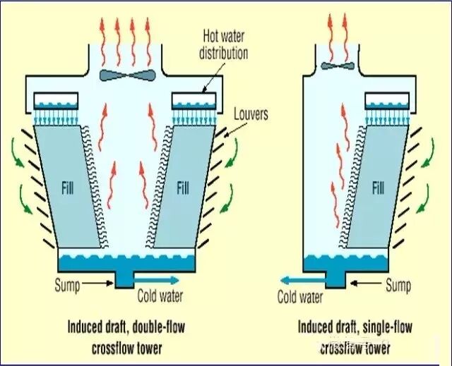 冷却水从顶部进入,流经填料层;空气从一侧或两侧进入,诱导风机使空气横向流过填料层。