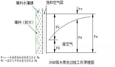 在湿式冷却塔中,热水的温度高,流过水表面的空气的温度低,水将热量传给空气,由空气带走,散到大气中去,水向空气散热有三种形式: